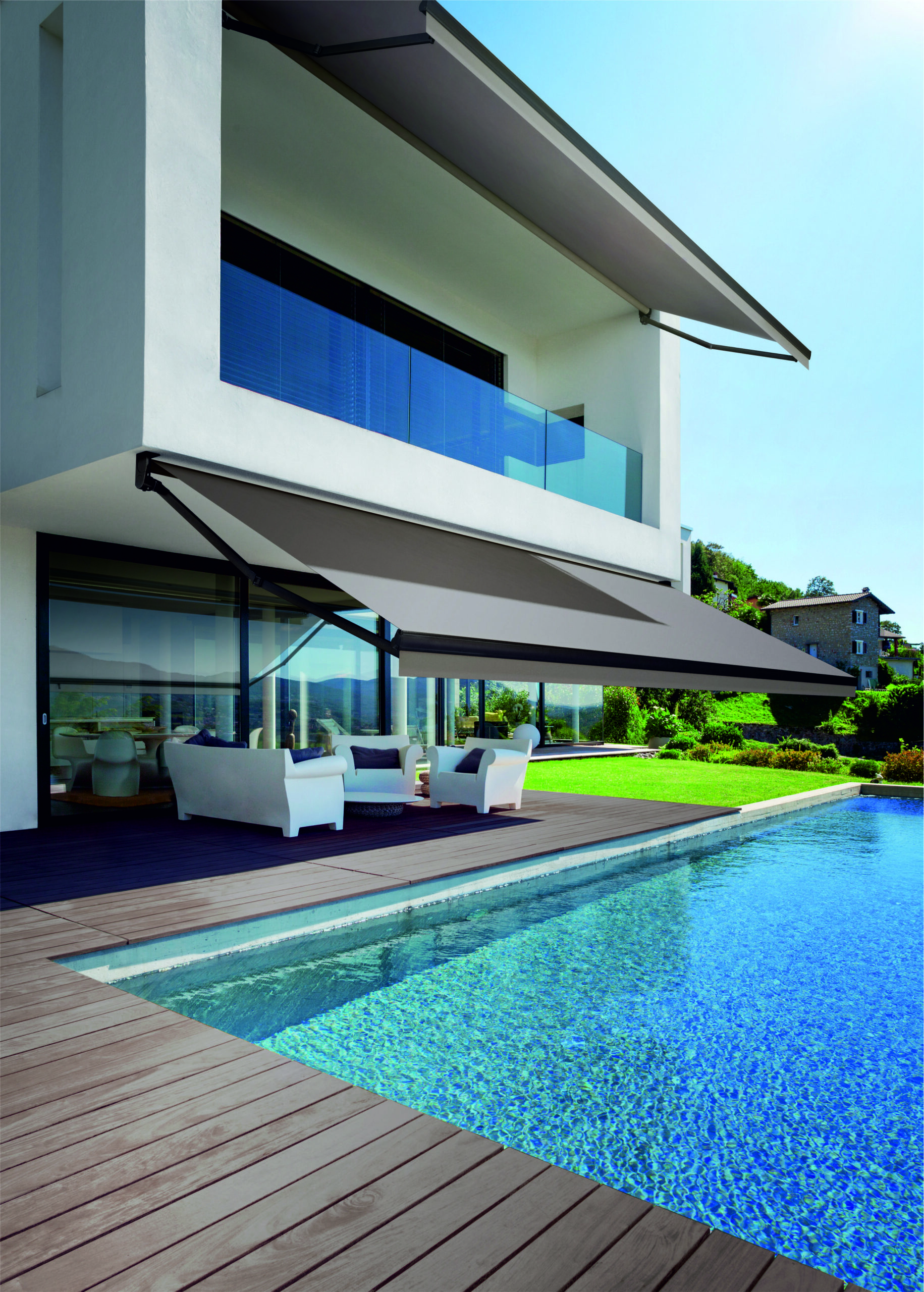 Graças à sua ampla gama de regulação da inclinação, adaptam-se facilmente a diferentes orientações e necessidades, oferecendo uma sombra eficaz em varandas, terraços, janelas ou fachadas. O seu design permite que o espaço sob o toldo fique completamente livre, tornando-o numa opção confortável e visualmente discreta.