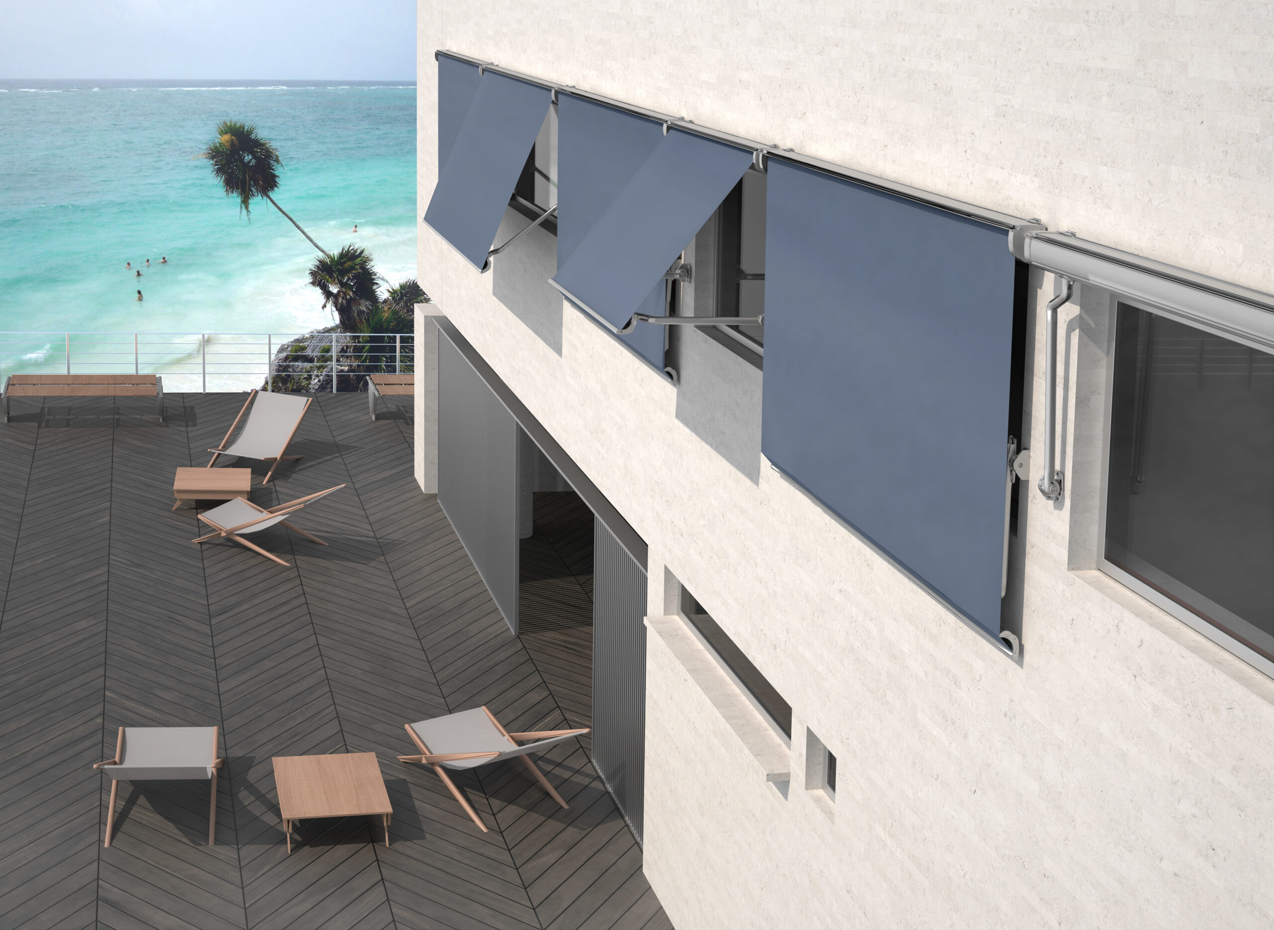 Este modelo foi especialmente concebido para instalação em janelas, mas sua versatilidade o torna igualmente adequado para fachadas, pátios ou varandas. Seu sistema de braços articulados, com ou sem tensão, permite uma projeção direta para o exterior, mantendo a passagem de ar e maximizando a sombra.
