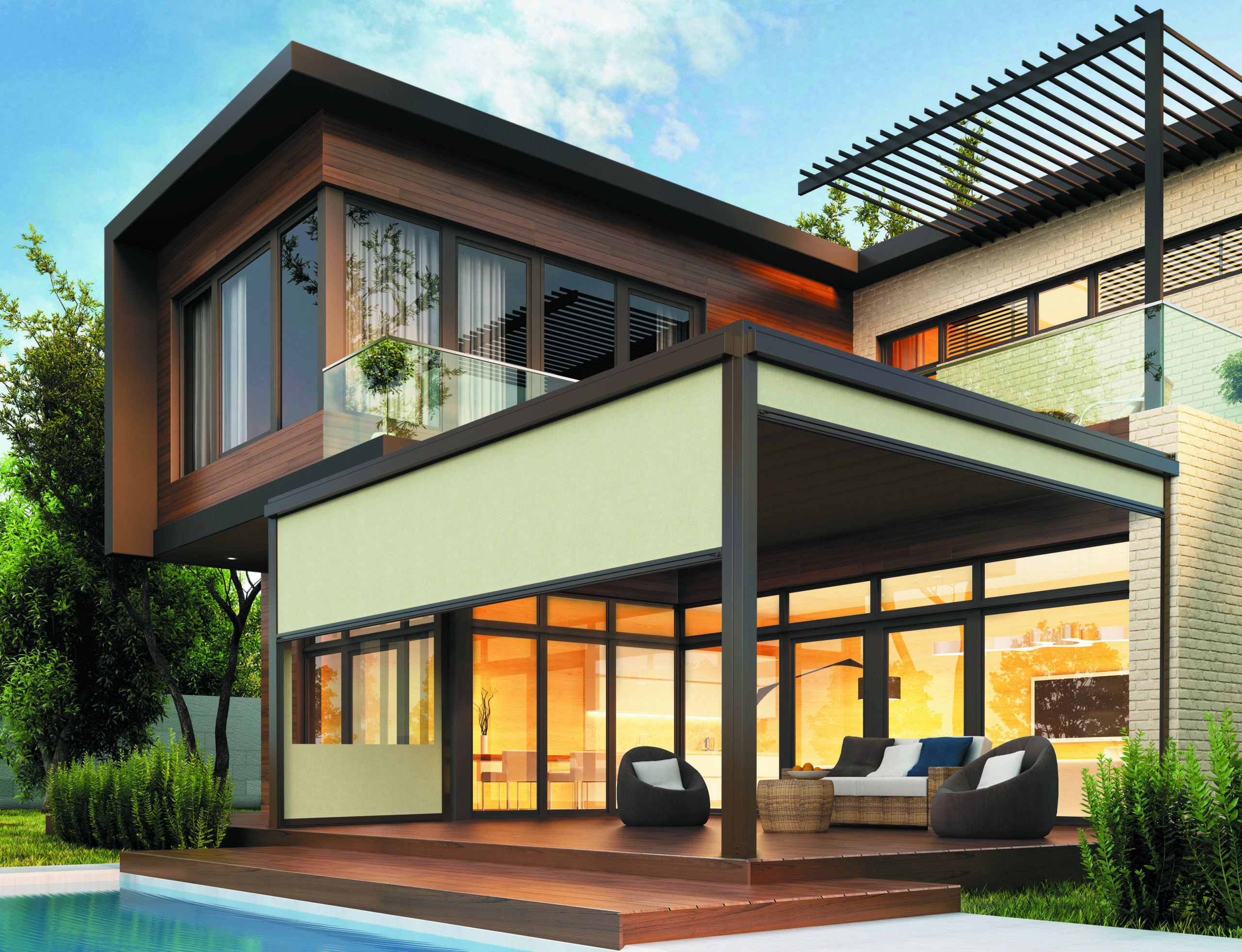 Modelo de toldo vertical com guias de alumínio, projetado como cortavento para pérgolas. Pode ser confeccionado com janela transparente.