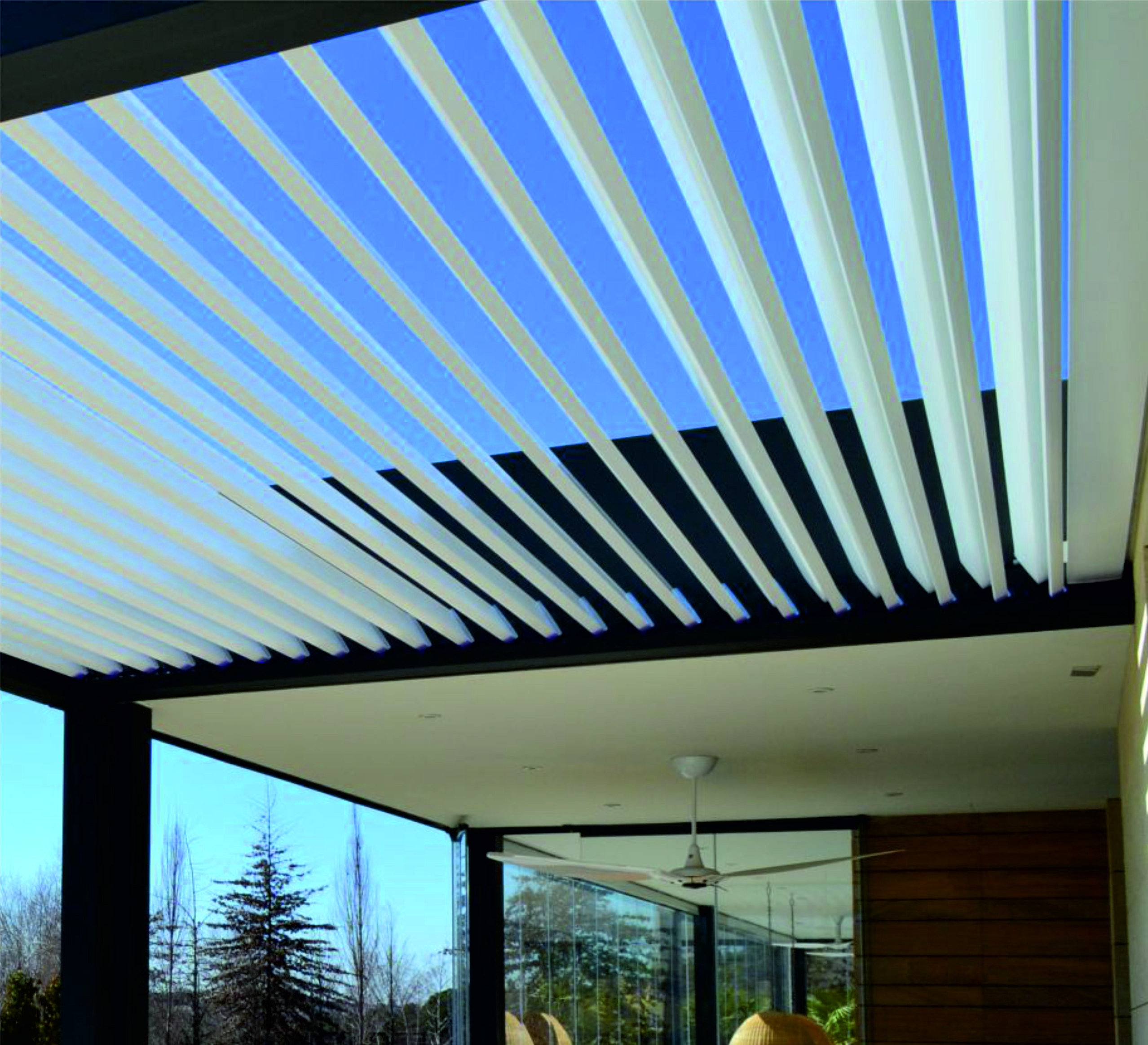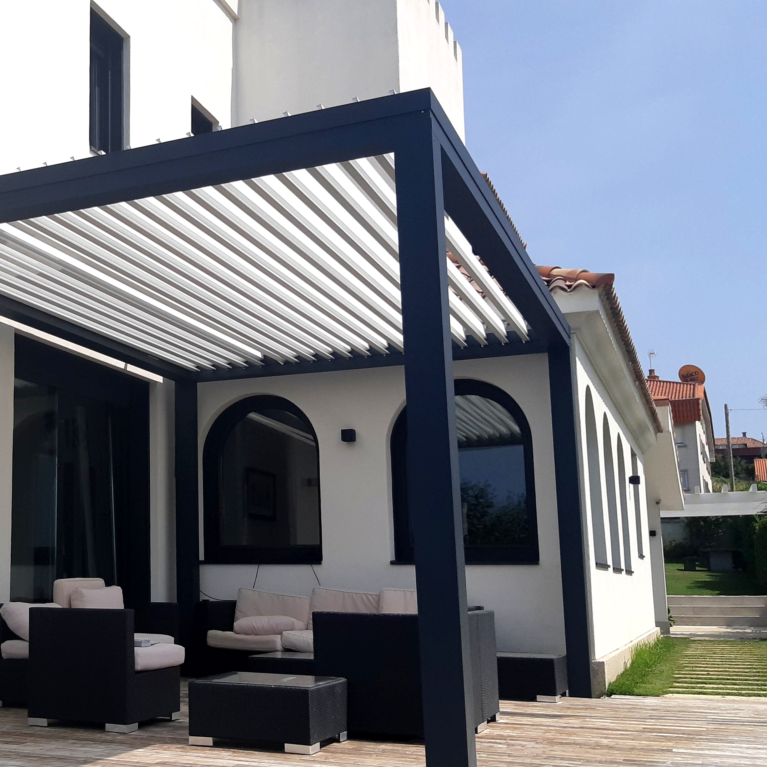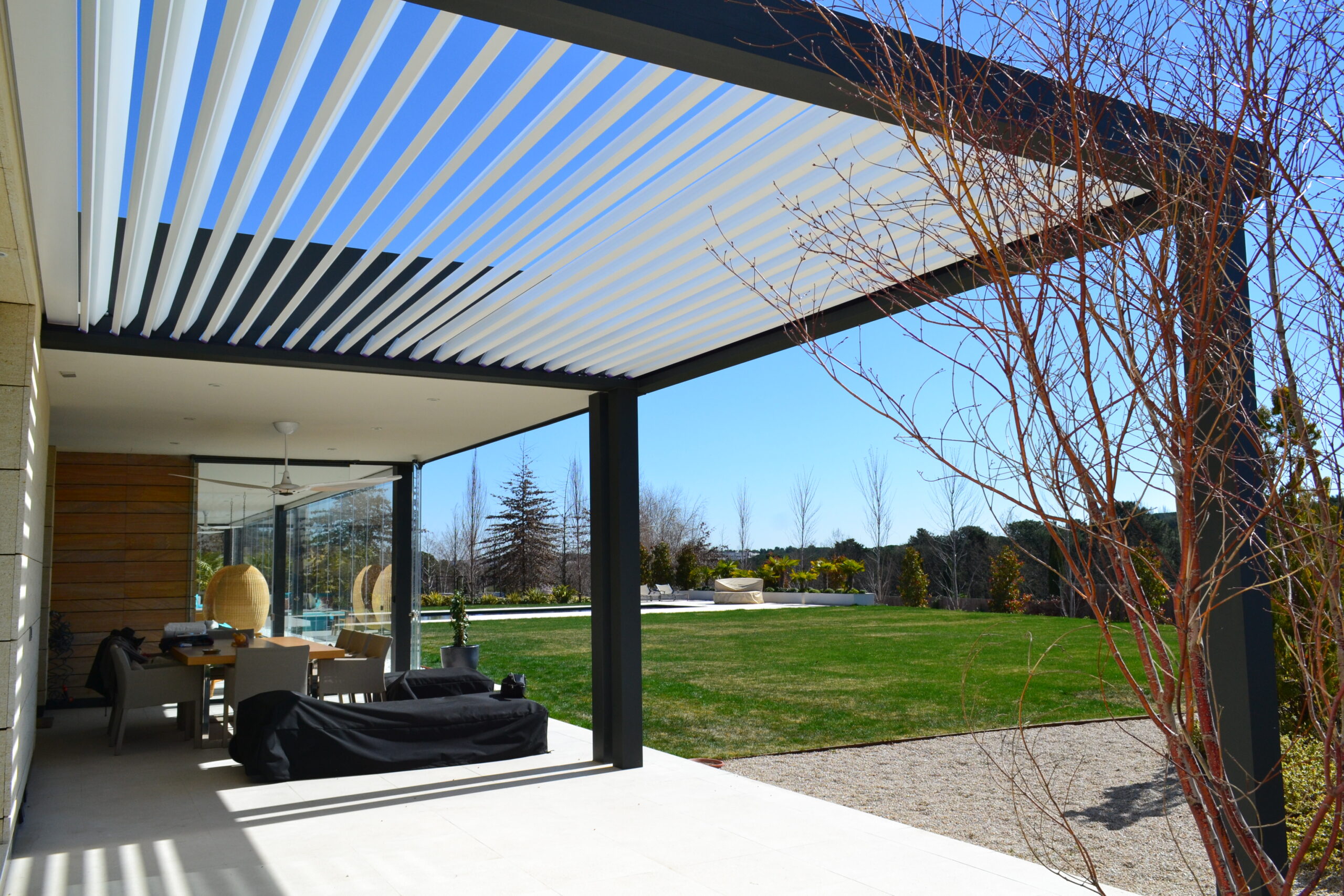 La Pérgola Bioclimática es una estructura de aluminio que le ofrece protección inteligente ante la lluvia, viento, nieve o radiación solar mediante la inclinación de sus lamas.