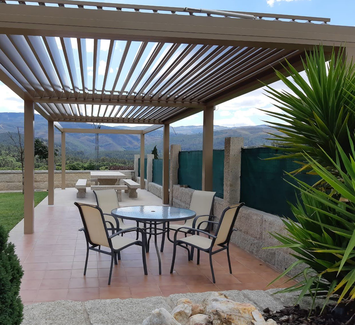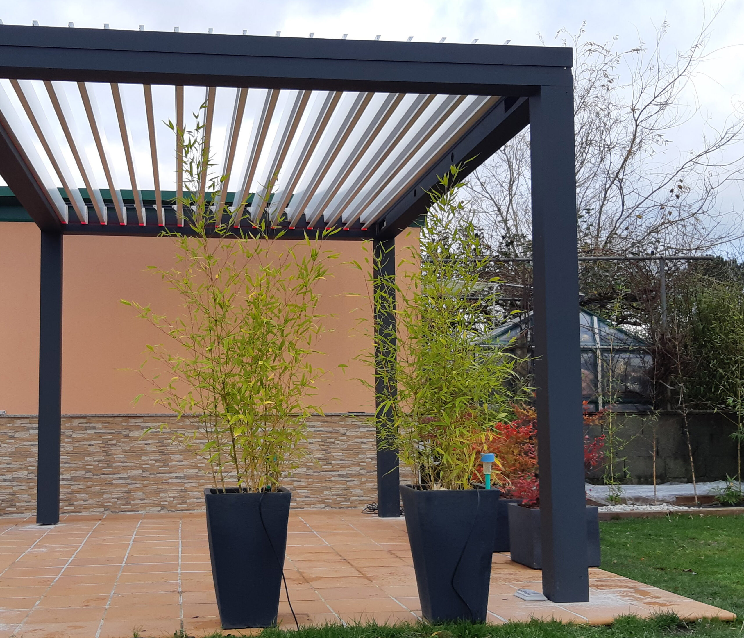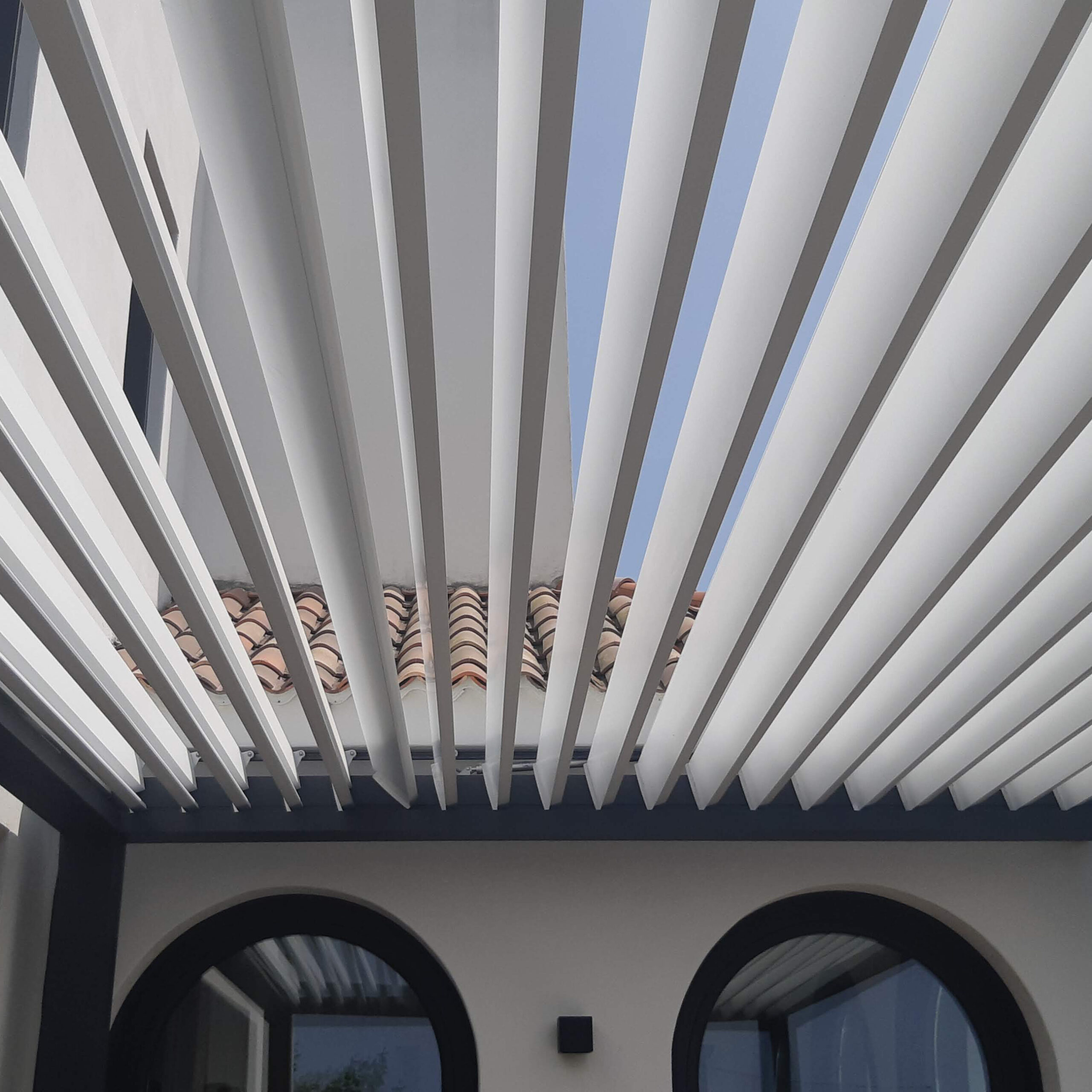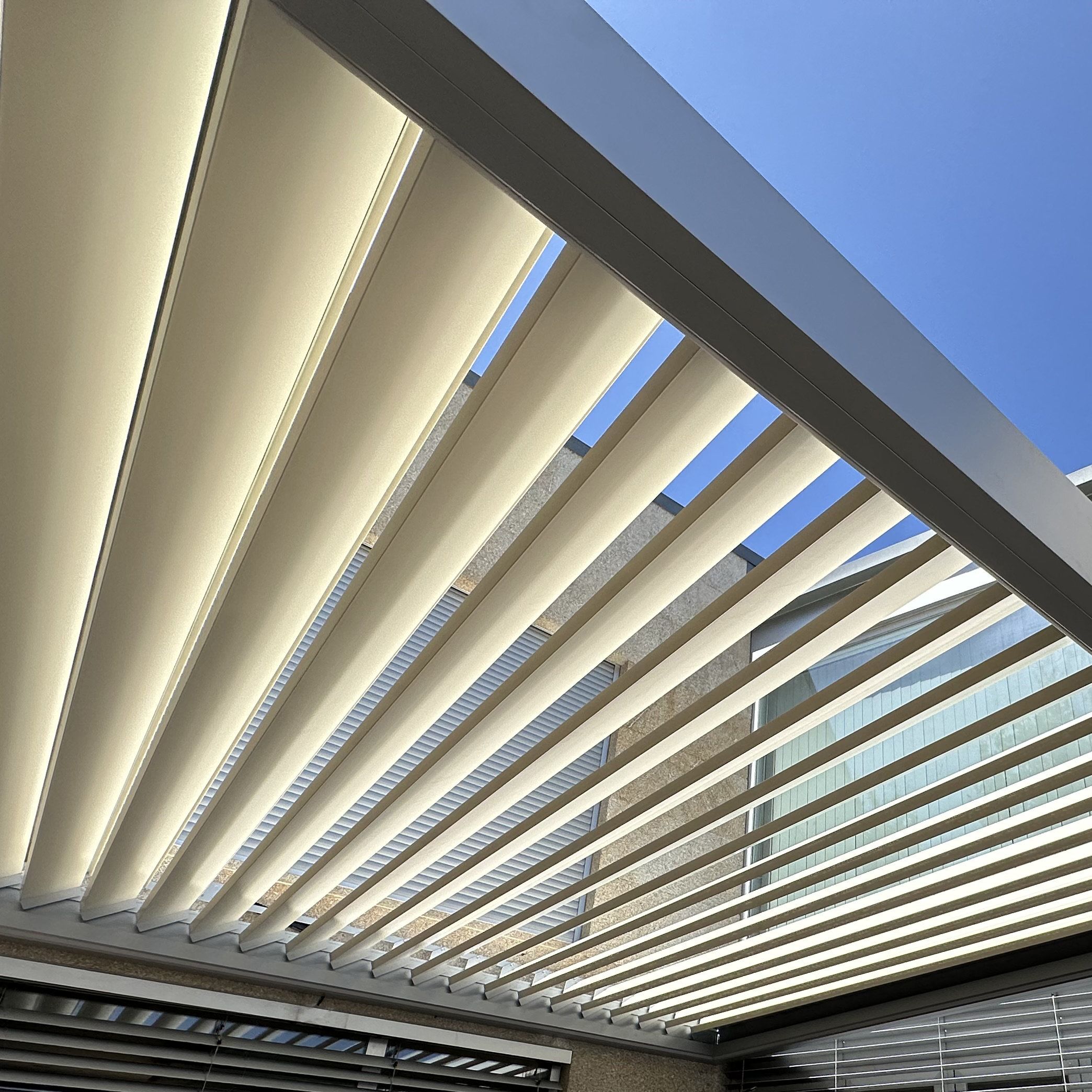 La Pérgola Bioclimática es una estructura de aluminio que le ofrece protección inteligente ante la lluvia, viento, nieve o radiación solar mediante la inclinación de sus lamas.